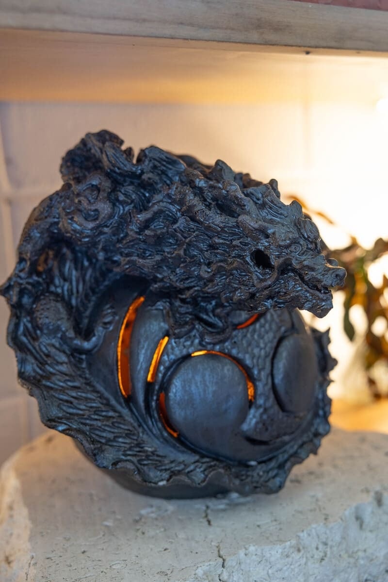 このランプは琉球の紋様に沖縄の地形を重ね、龍の体で無限を形を描いたデザイン。